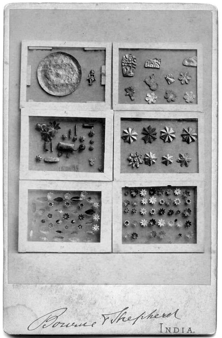 " ... ทั้งนี้ จากรายงานของจอห์น กาย ใน Tree & Serpent : Early Buddhist Art in India, 200 BCE – 400 CE ที่ระบุว่าเฉพาะที่อยู่ในครอบครอบของครอบครัวเป๊ปเป้ถึงปัจจุบันนี้ มีจำนวน ๓๓๑ ชิ้น และที่ได้นำมาจัดแสดงในนิทรรศการเท่าที่ลองจำแนกแยกพวกคร่าว ๆ พบว่าเป็นดาวหรือดอกไม้ (ตามที่มักเรียกสลับกันตามแต่ละคนมองว่าเป็นดาวหรือดอกไม้) จำนวน ๙๒ ชิ้น (เป็นแผ่นทองคำ ๒๔ ชิ้น) เป็นใบไม้ ๑๔ ชิ้น เป็นทรงปิรามิด ๖ ชิ้น ตรีรัตนะ ๒ ชิ้น และที่เป็นลูกปัดรูปทรงอื่น ๆ อีกจำนวนหนึ่ง ... "