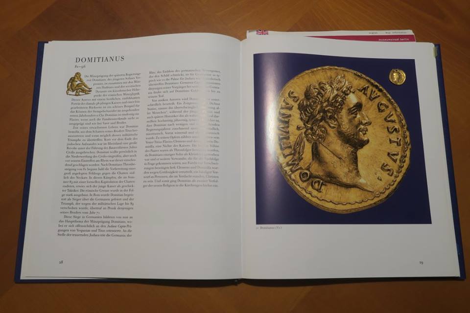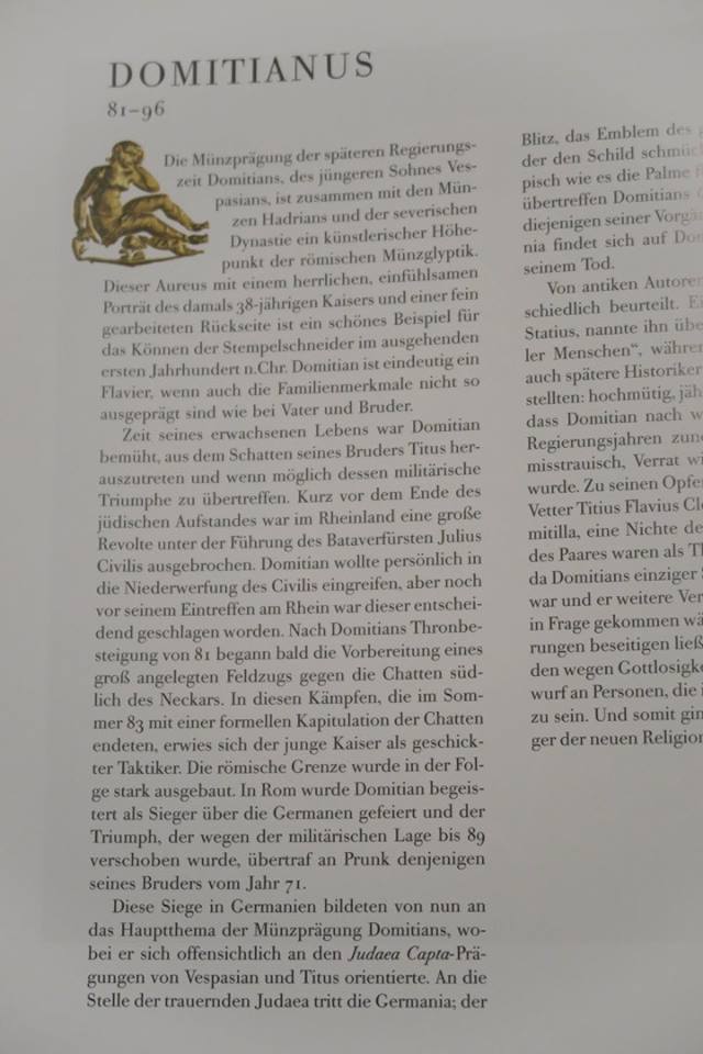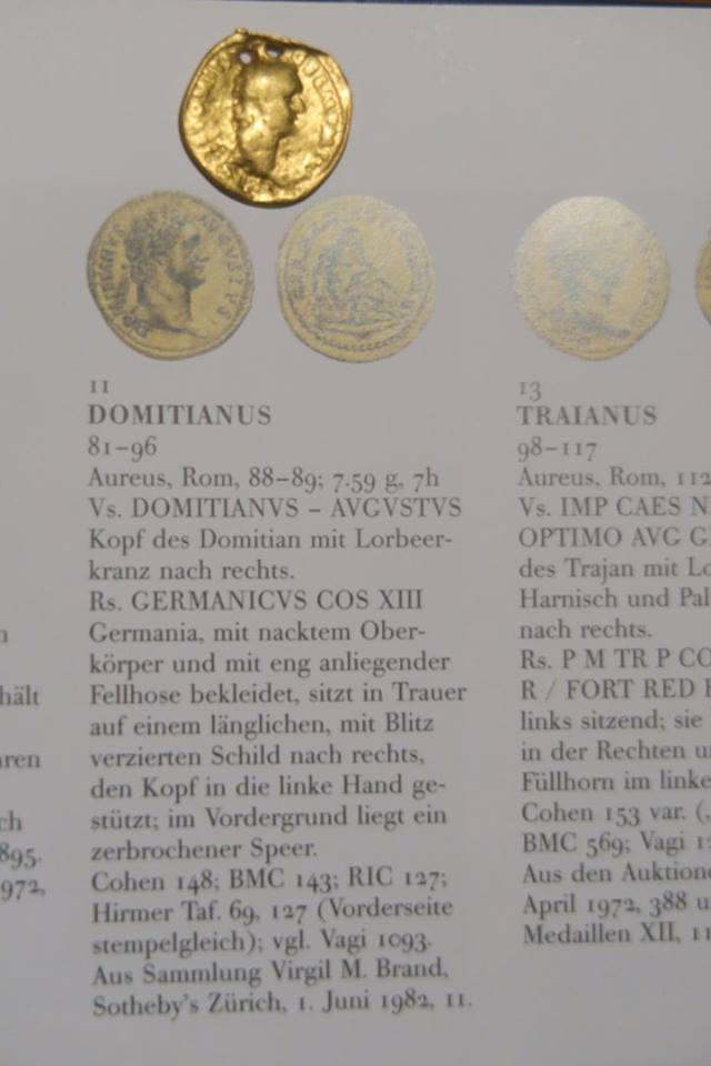 ด้านหลังเธอว่าเป็นภาพเทพีเอธีน่า ถือหอกและโล่ ที่เท้ามีนกฮูกอยู่ด้วย พร้อมคำจารึกบอกว่าผู้พิชิตเผ่าเยอรมันิคที่มิใช่เยอรมันนีทุกวันนี้ โดยเหรียญในหนังสือเป็นรูปสาวเยอรมันิคนุ่งผ้ายาวนั่งท้าวแขนโศกเศร้าหมดสภาพ หอกข้างกายก็หักวางอย่างผู้พ่ายแพ้ ข้อความเขียนว่า GERMANICUS COS XIIII หมายความว่าเป็นเหรียญฉลองความเป็น ผู้พิชิตเยอรมันิค ครั้งที่ ๑๔