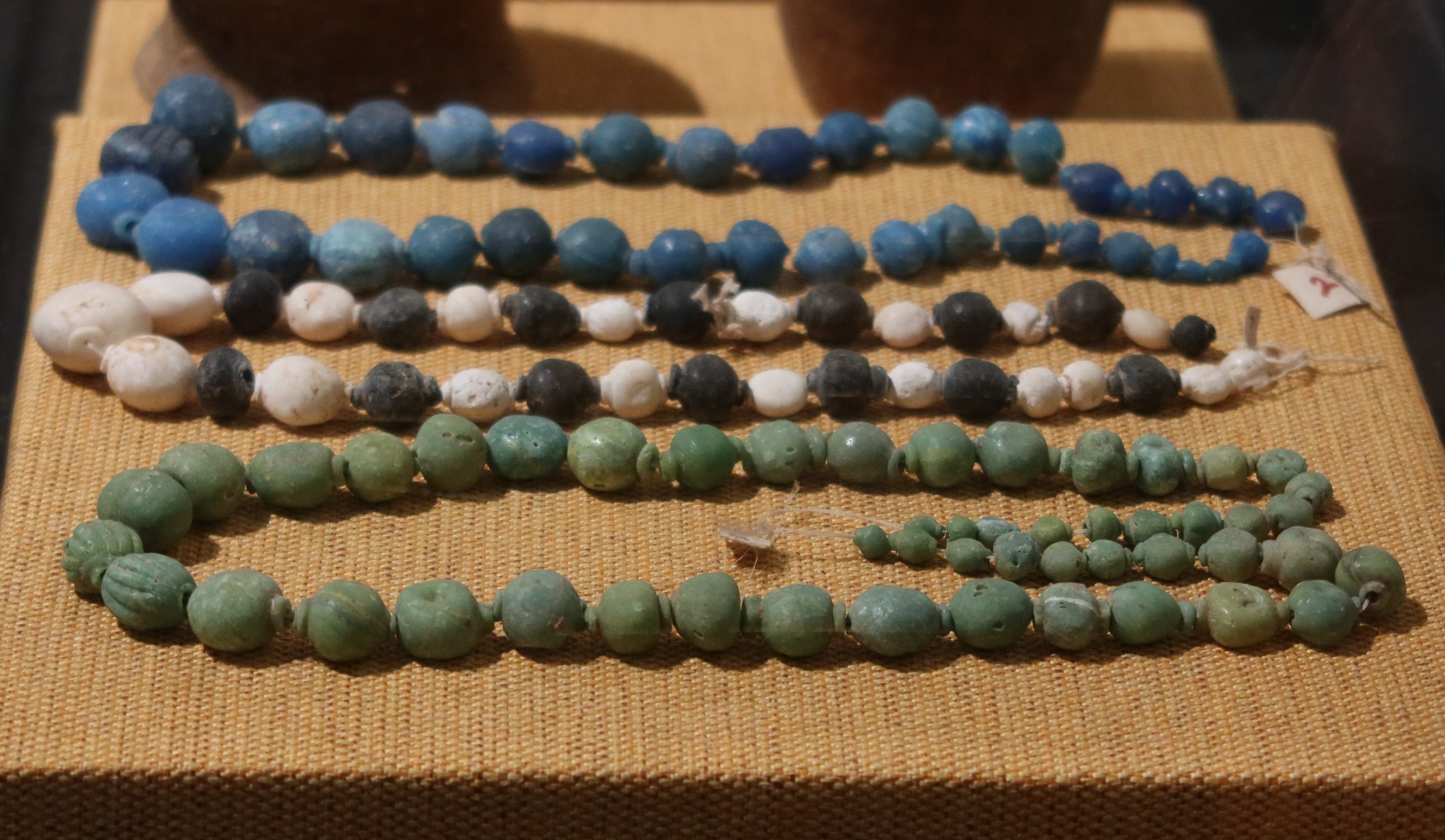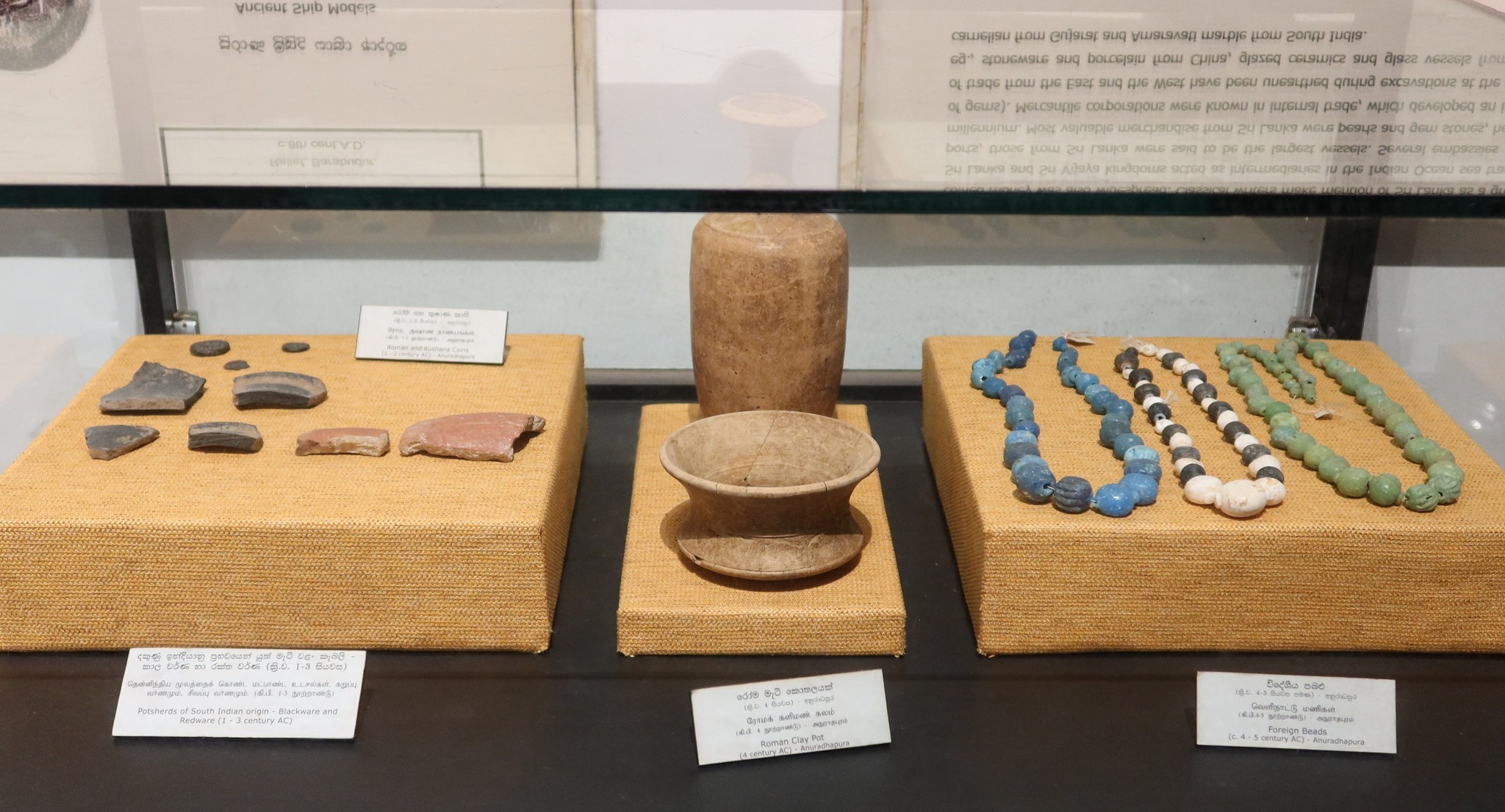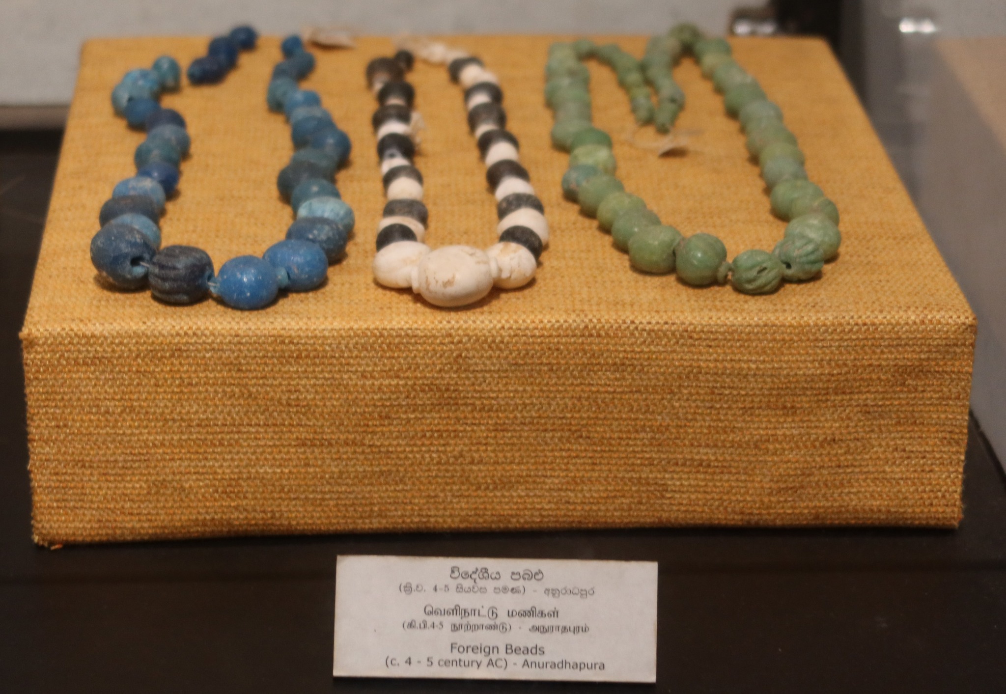ทั้งสามเส้นเป็นลูกปัดทรงทุ่น บอกว่าพบที่อนุราธปุระ มาจากการค้าต่างแดน