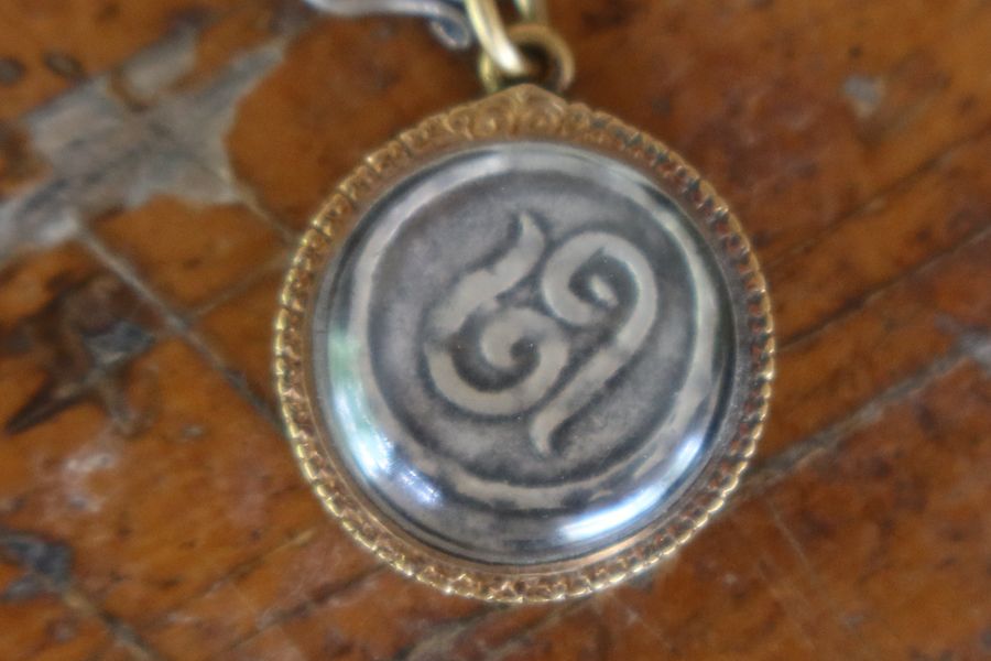 โดยยังมีเหรียญเงินลวปุระอยู่บนคอเส้นหนึ่ง