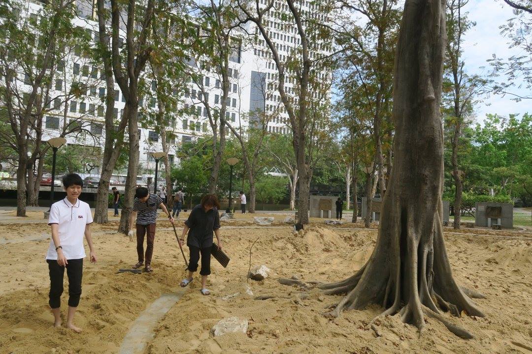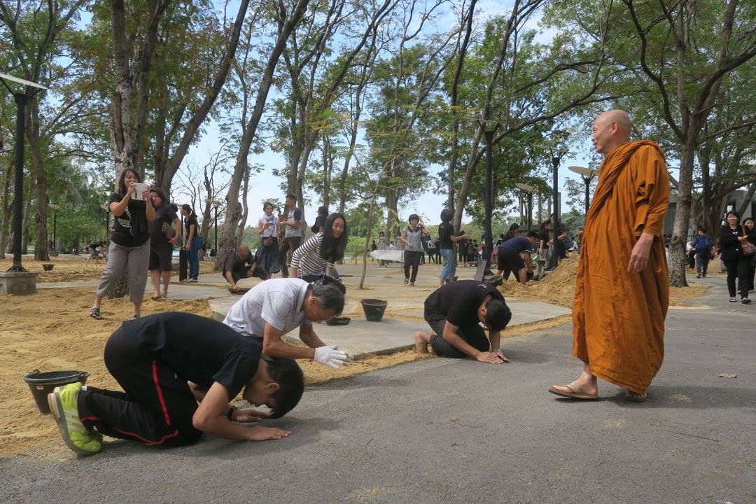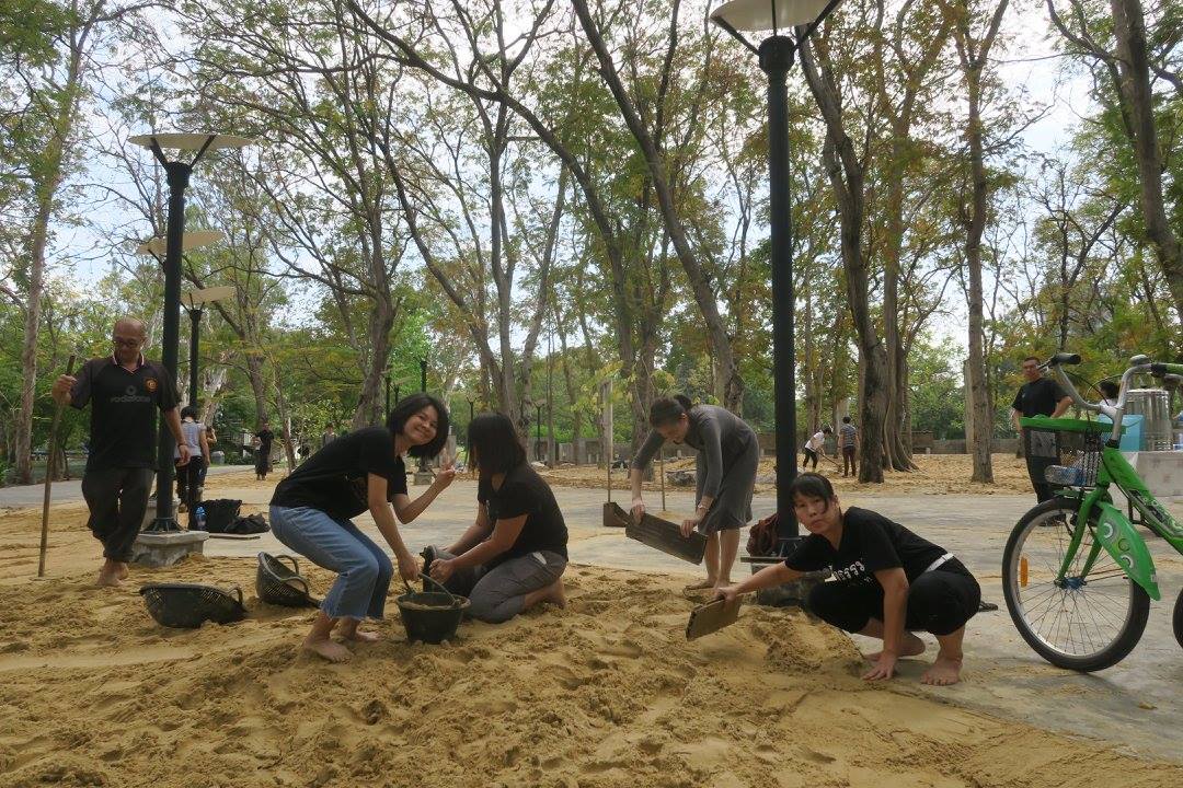 ชวนคนลงไปช่วยเกลี่ยทรายที่สวนพุทธธรรมสำหรับงานเทศกาลเจริญสติ