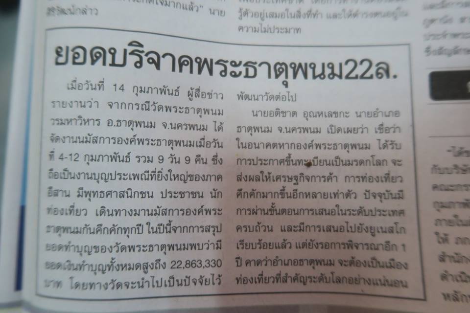 แต่ที่ชอบใจที่สุดคือที่พระธาตุพนม เพราะไปมาทุกทีเจอของดีเรื่อย ๆ โดยเฉพาะที่หน้าห้อง สนง.วัด มีการทำรายงานรับจ่ายประจำวัน ประจำงานอย่างชัดเจนตลอดมา อย่างงานบูชาพระธาตุพนม มาฆบูชาที่เพิ่งผ่าน ท่านก็แถลงกันชัดเจนอย่างในข่าว แถมท่านนายอำเภอมาชี้แจงเรื่องมรดกโลกอย่างเป็นการเป็นงาน ผมเคยเรียนว่ารบกวนท่านช่วยพัฒนาระบบให้ทุกอย่างเข้าที่เพื่อนายอำเภอใหม่มาจะได้สานงานวัดได้ดีอย่างที่ท่านทำ ท่านบอกว่า ผมเป็นข้าฯ วัด ขออยู่ที่นี่อย่างนี้แหละครับ