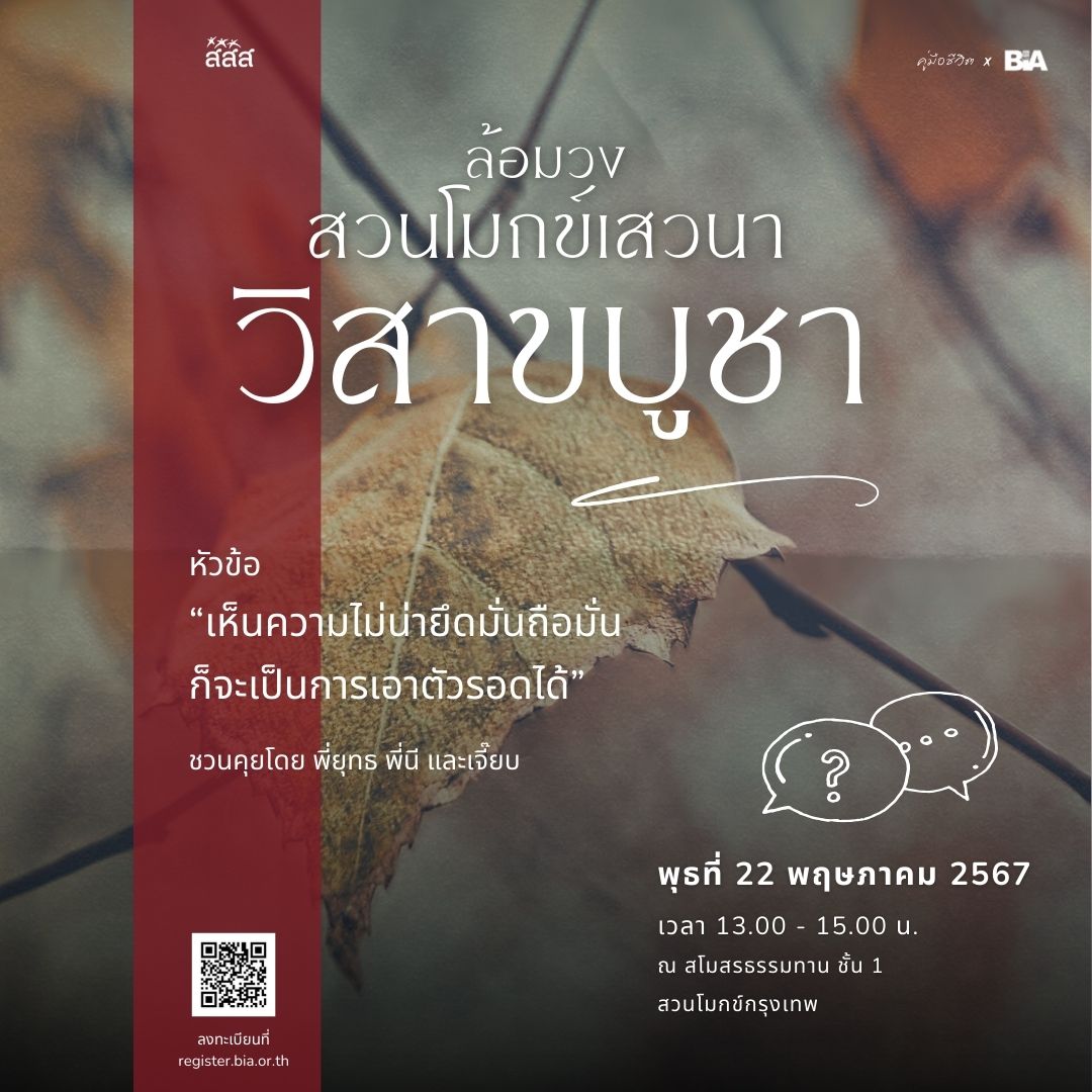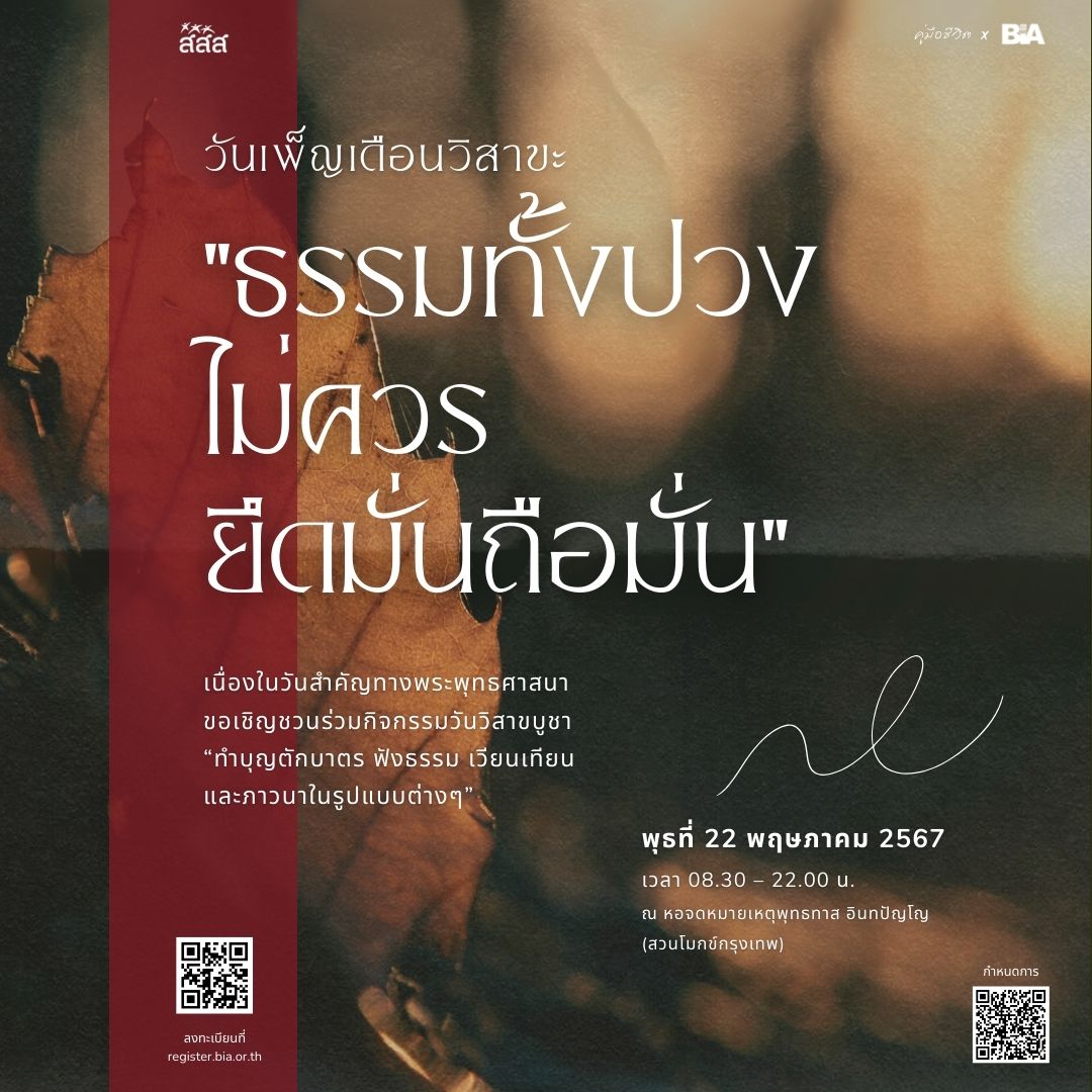 วันเพ็ญเดือนวิสาขะ “ธรรมทั้งปวง ไม่ควรยึดมั่นถือมั่น” เนื่องในวันวิสาขบูชาปี 2567 ชวนร่วมงานทำบุญตักบาตร ฟังธรรม เวียนเทียนในสวน และภาวนาในรูปแบบต่างๆ ที่สวนโมกข์กรุงเทพ