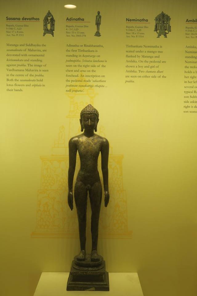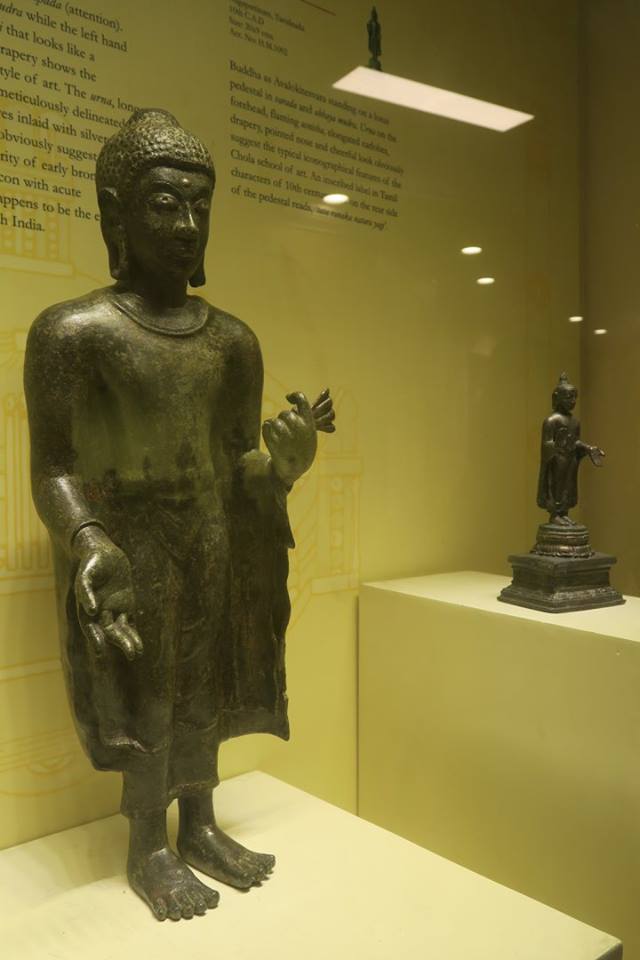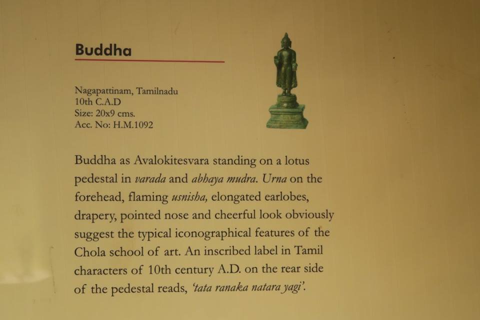 ห้องแรกที่เข้าเป็นเครื่องสำริดที่ส่วนใหญ่ก็เป็นเทพทั้งหลายในศาสนาฮินดู ที่พบพระพุทธเจ้าก็ตามนี้ครับ มีอยู่ ๒ ตู้ ตู้หนึ่งสมัยอมราวดีที่พบในละแวกนี้ เฉพาะองค์สำริดใหญ่หน่อยนั้นสำคัญมาก ๆ ส่วนองค์เล็กได้มาจากนาคาปัฏฏินัมในทมิฬนาดูโน่น