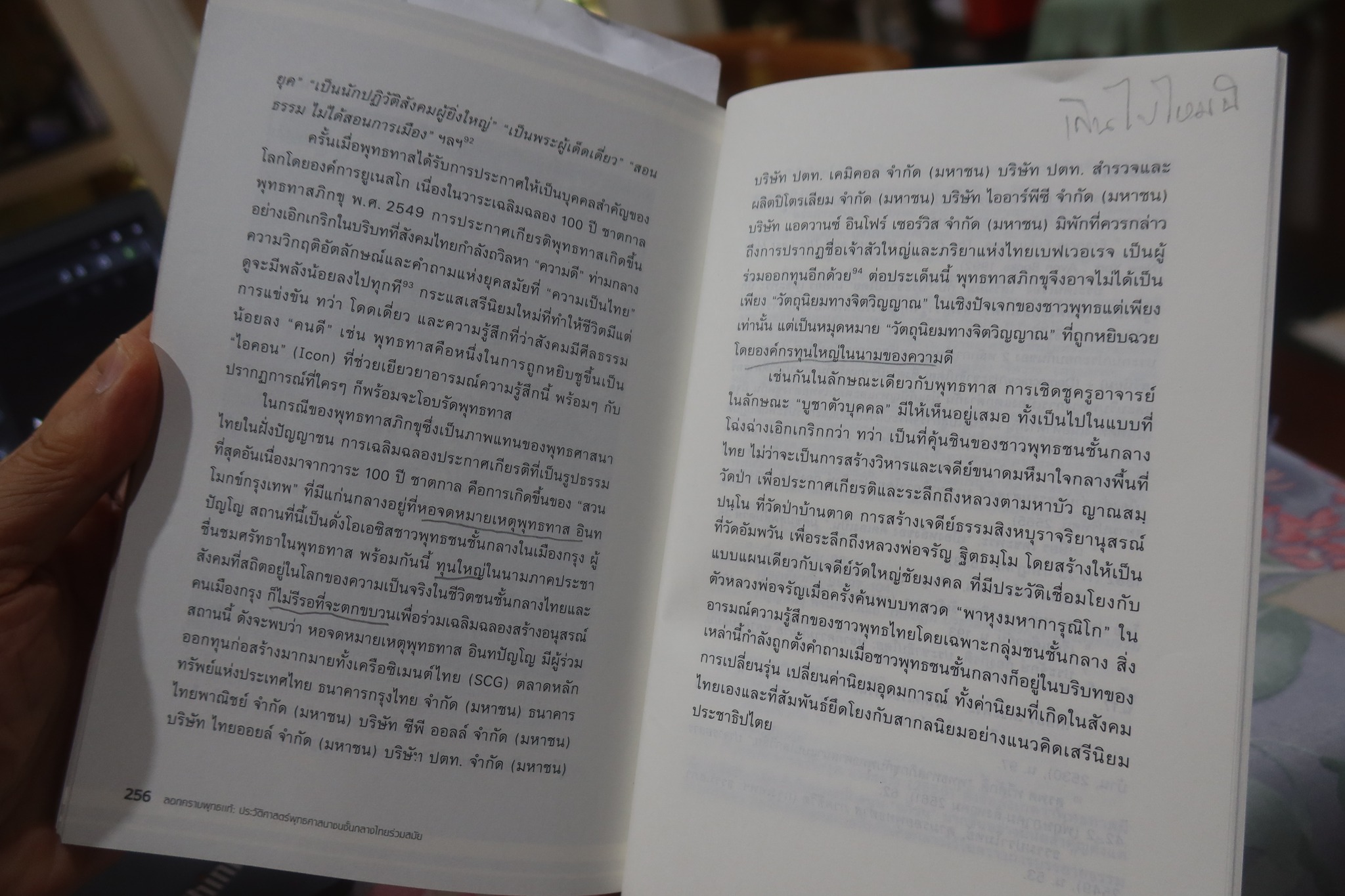 " ... ในกรณีของพุทธทาสภิกขุซึ่งเป็นภาพแทนของพุทธศาสนาไทยในฝั่งปัญญาชน การเฉลิมฉลองประกาศเกียรติที่เป็นรูปธรรมที่สุดอันเนื่องมาจากวาระ ๑๐๐ ปี ชาตกาล คือการเกิดขึ้ยของสวนโมกข์กรุงเทพที่มีแก่นกลางอยู่ที่ หอจดหมายเหตุพุทธทาส อินทปัญโญ - สวนโมกข์กรุงเทพ สถานที่นี้เป็นดั่งโอเอซิสของชาวพุทธชนชั้นกลางในเมืองกรุง ผู้ชื่นชมศรัทธาในพุทธทาส พร้อมกันนี้ ทุนใหญ่ในนามภาคประชาสังคมที่สถิตอยู่ในโลกของความเป็นจริงในชีวิตชนชั้นกลางไทยและคนเมืองกรุง ก็ไม่รีรอที่จะตกขบวนเพื่อร่วมเฉลิมฉลองสร้างอนุสรณ์สถานนี้ ดังจะพบว่า ... ต่อประเด็นนี้ พุทธทาสภิกขุจึงอาจไม่ได้เป็นเพียง วัตถุนิยมทางจิตวิญญาณ ในเชิงปัจจัเจกของชาวพุทธแต่เพียงเท่านั้น แต่เป็นหมุดหมาย วัตถุนิยมทางจิตวิญญาณ ที่ถูกหยิบฉวยโดยองค์กรทุนใหญ่ในนามของความดี ... "