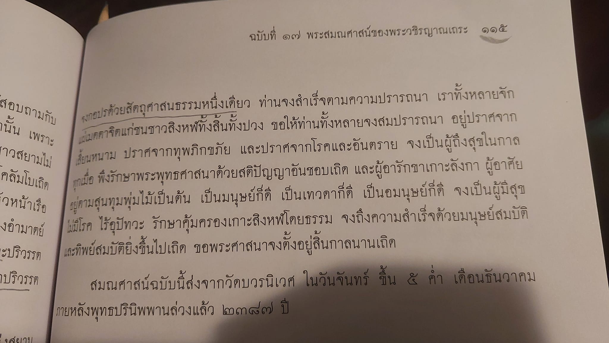 เราชาวสยามพิจารณาพระพุทธศาสนาอย่างละเอียดรอบคอบแล้วว่า เป็นคำสอนทนต่อการพิสูจน์ มีสาระ ไร้มลทิน มีกระพี้ มีปัญญา ผู้มีปัญญาควรเว้นมลทินเสียแล้วถือเอาส่วนที่เป็นสาระเท่านั้น เว้นส่วนที่ผิดแล้วถือเอาส่วนที่ถูก ควรดำรงตนให้มั่นคงด้วยการปฏิบัติชอบด้วยกาย วาจาและใจ ชื่อว่าเป็นการสั่งสมบุญสั่งสมกุศลแล้ว ...