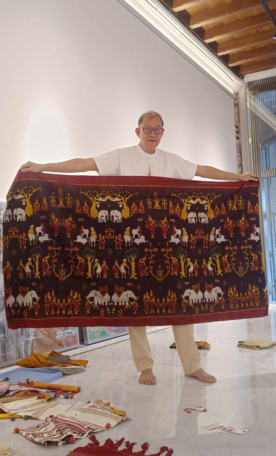 ท่ามกลางผ้าที่นำมาแขวนห้อยแสดงนับร้อยผืน จากร่วม ๑๐ ประเทศ