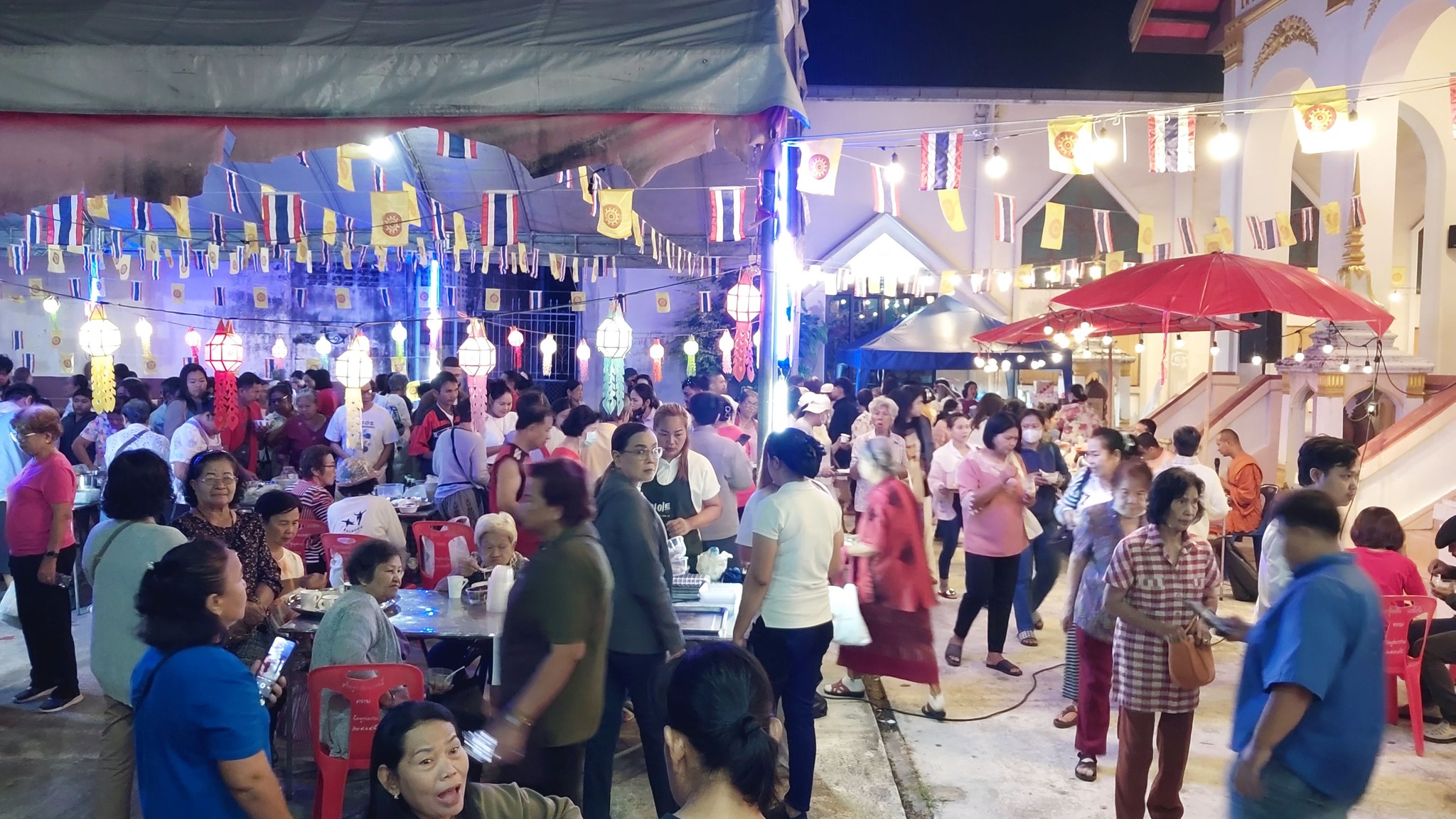 จากนั้นชวนขนเก้าอี้ให้คนมาเอาบุญ