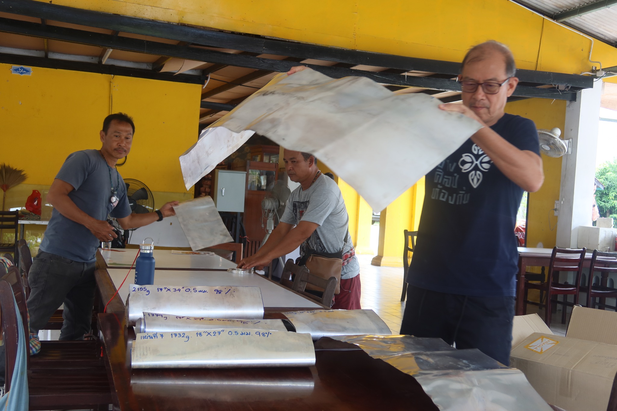 แผ่นเงินก็ให้หลอมรีดลงมาจากกรุงเทพ เพื่อจะได้แผ่นกว้างได้ถึง ๑๘ นิ้ว