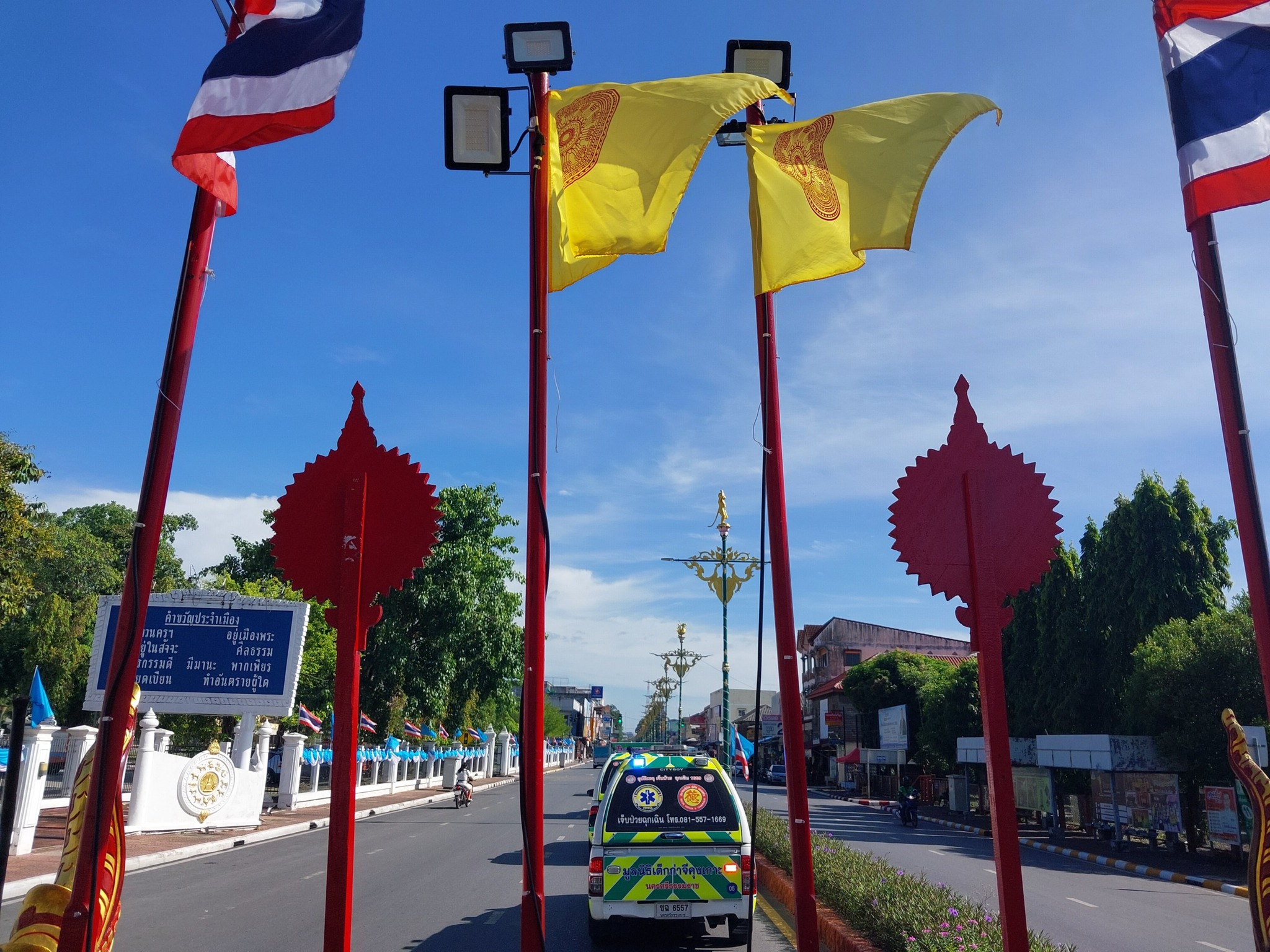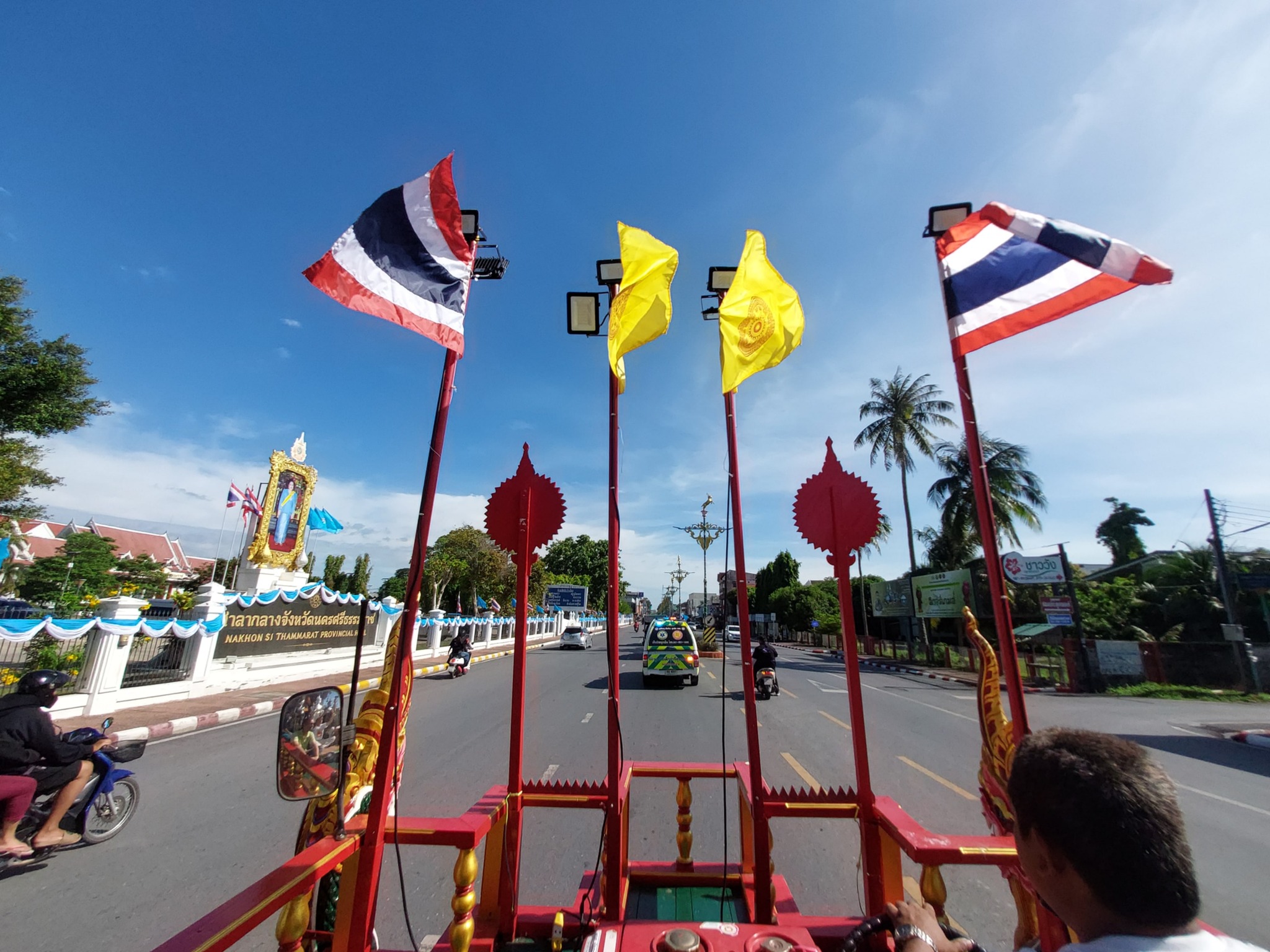 มีธงพระกับธงชาติเป็นสง่า ปลิวไสวนำหน้า