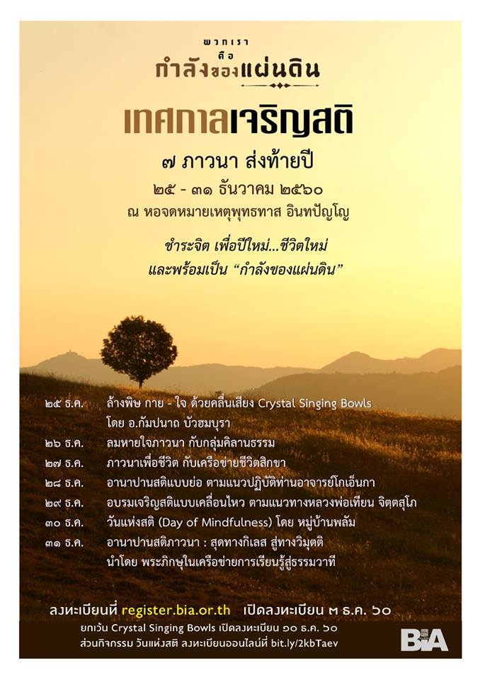 มาเป็นปฏิบัติธรรมข้ามคืนข้ามปี ร่วมกันกับพี่น้องเพื่อนพ้องชาวพุทธไทย โดยมีพี่ใหญ่ คือพระภิกษุสงฆ์จากหลายแห่งเมตตามาร่วมด้วย ๒) เจริญสติภาวนากัน ๗ วัน ๗ ภาวนาส่งท้ายปี