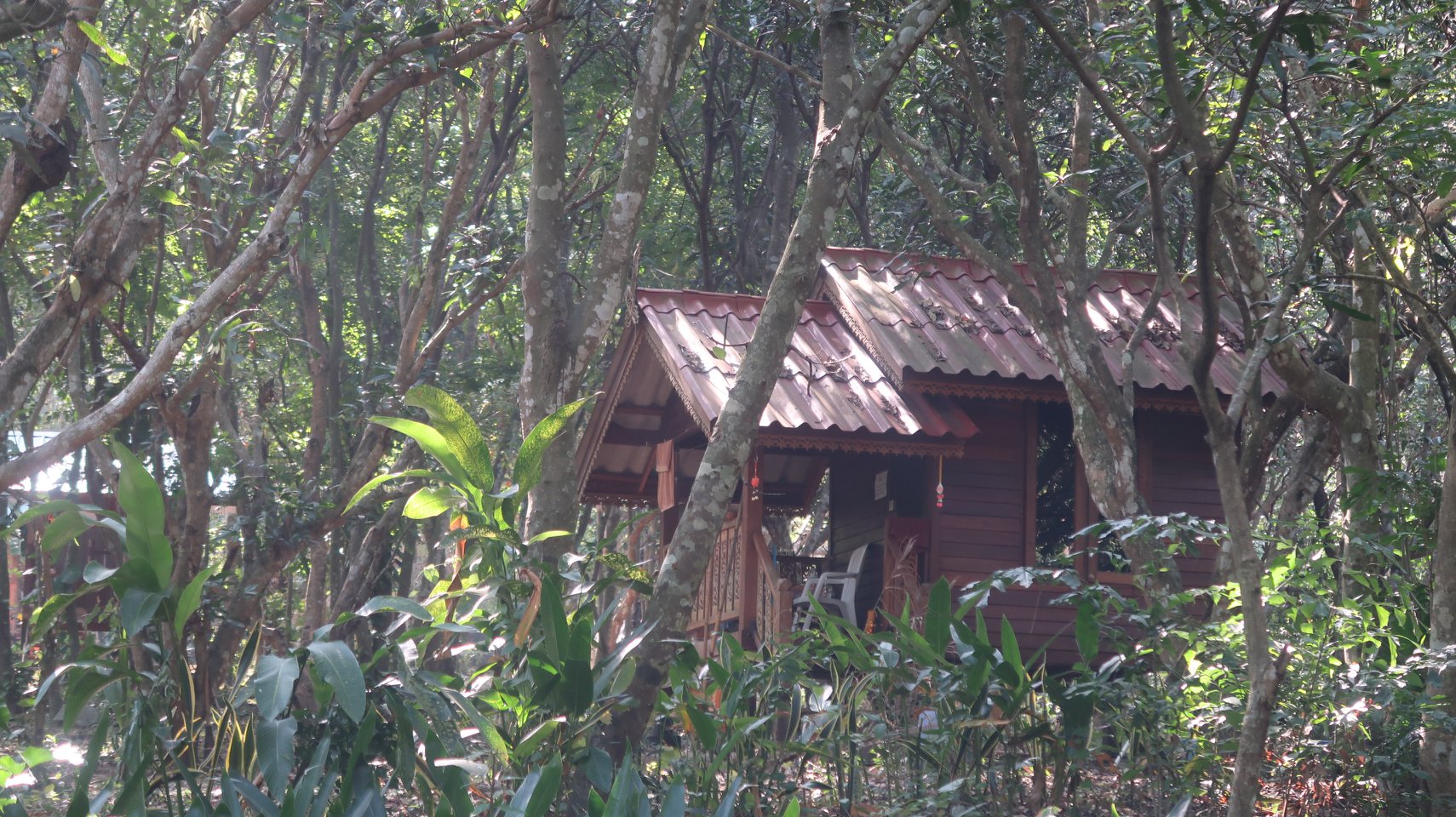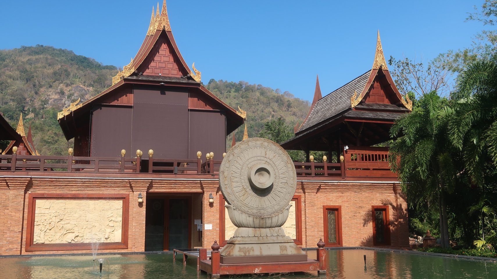 เมื่อพระท่านเริ่มทำภัตตกิจการขบฉันและชาววัดมีการสวดมนต์ภาวนานั้นพวกเราจึงปลีกลัดเลาะริมอ่างเก็บน้ำขึ้นไปยังวิหารเจดีย์แห่งอารามผ่านย่านเขตพำนักสงฆ์แสนสัปปายะมีป้ายข้อธรรมท่านอาจารย์ชาเหมือนถามว่าตัวเรานี้เป็นมนุษย์ หรือว่าหมา ...พอถึงวิหารเจดีย์ ที่มีพระธรรมจักรเป็นประธานอยู่กลางน้ำนับว่าเป็นอีกนวกรรมที่ไม่เคยคิดว่าจะมีทำเช่นนี้รายล้อมด้วยรูปจำลองสถูปธาตุท่านอาจารย์ชาปั้นด้วยดินเผาอย่างอิฐ และกลึงด้วยไม้วางรายรอบแดดกำลังเริ่มแรงอุ่น แต่ลมหนาวก็ยังโชยแรงเย็นหมดเวลาที่จะเดินไปถึงอุโบสถเห็นบัวฉัตรบานกล้าท้าแสง