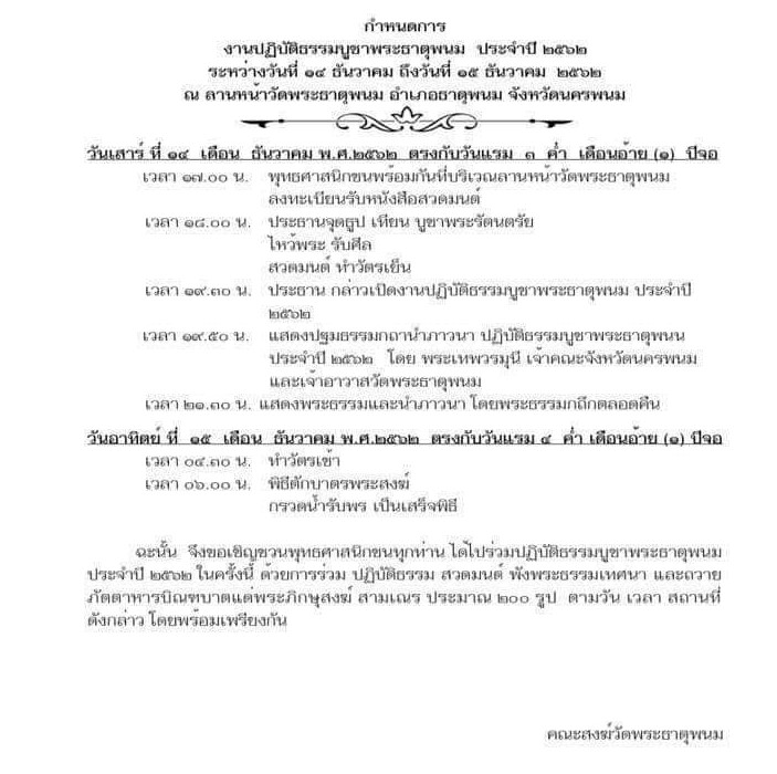 มีหลายท่านถามว่าปีนี้ มีปฏิบัติบูชาส่งท้ายปีที่ธาตุพนมไหม ? เมื่อวานนี้ เพิ่งได้รับข่าวนี้ จาก ททท.ภาคอีสานและเช้านี้ ท่านพระครูไก่ - พนมปรีชากร กรุณาให้รายละเอียดว่าตามที่พวกเราจากสวนโมกข์กรุงเทพไปเริ่มถวายงานไว้และ ททท. กับ จังหวัดนครพนม รับช่วงไว้เพื่อสานต่อนั้นปีนี้ทางวัดจัดเองแล้วโดยร่วมกับท่านพระครูปริยัติฯ แห่งคณะมหาทานลำปาว เป็นเจ้าการ รายละเอียดต่าง ๆ ตามแนบครับ