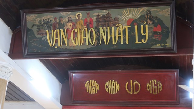 รายการสุดท้ายวันนี้ พี่ ๆ บอกว่า ขอแวะดูวัดที่เล่าหน่อยเป็นวัดของศาสนาใหม่ที่มีแต่ในเวียดนามเมื่อประมาณ ๑๐๐ ปีที่แล้วด้วยหลักว่า ทุกศาสนาล้วนมีหลักร่วมกัน เชิญนานาศาสดามาร่วมเป็นที่นับถือในรูปก็มี พระพุทธเจ้า พระเยซู พระมะหะหมัด กับเล่าจื๊อและข่งจื๊อ โดยมีสัญญลักษณ์ร่วมเป็นรูปดวงตากลางลูกโลกศาสนิกเขานุ่งขาว กล่าวกันว่าทั่วเวียตนามมีสัก ๒ - ๓ ล้านคนวัดนี้ที่ดานัง กล่าวกันว่าใหญ่ที่สุดในเวียดนามตอนกลางมีศาสนิกอยู่ราว ๕ หมื่นคนใครสนใจ ก็ลองค้นดูได้ ที่ Cao Dai ผมฟังเขาออกว่า เค่าได๋แต่พี่น้องผมฟังว่า เข้าได้ แล้วถามว่าเข้าไปแล้ว ออกได้ไหม ? รอบวัดสะอาดสะอ้านประมาณนี้เห็นมีรูปสัญญลักษณ์หลายอย่างที่เลือกเอามาใช้ด้วยครับ