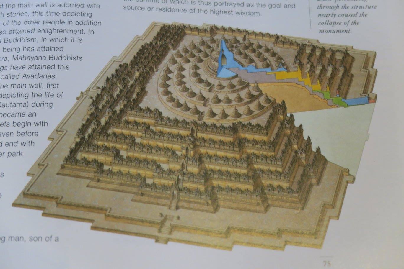 จากนั้น บนฐานเหลี่ยมทั้งหมดนั้น ท่านหมายให้เรียนรู้เรื่อง “รูปภพ” ประดับด้วยภาพพุทธประวัติ ชาดกและอวทานต่าง ๆ กว่า ๑๕๐๐ ภาพ จนถึงฐานกลม ๓ ชั้นพร้อมพระสถูปและพระพุทธรูปปางต่าง ๆ ที่หมายถึง “อรูปภพ” จนสุดที่องค์สถูปประธานอันเป็น “อริยภูมิ” ล่าสุด มีข้อเสนอที่ผมชอบมากขึ้นว่า ที่ฐานทั้ง ๔ ด้านที่มีย่อมุมอย่าง “แมนดาลา” ของทิเบต หรือ “มณฑล” แบบไทย ๆ นั้น ท่านว่าหากได้ดูภาพที่ฐาน จะพบว่าสะท้อนถึง “ปฏิจจสมุปบาท” ทั้ง ๑๒ ห่วงโซ่ว่าทุกสิ่งอย่างล้วนเป็นไปตามกฏแห่ง “อิทัปปัจจยตาปฏิจจสมุปบาท” ที่พระพุทธองค์ทรงตรัสรู้และแสดงไว้อย่างวิเศษสุด ๆ