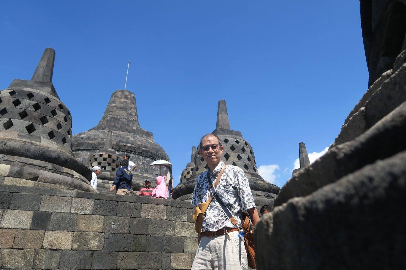 สำหรับผม การไปรอบนี้ กับกัลยาณมิตร คณะ SCG และ สื่อมวลชน จึงชวนไปชมภาพชุด “กามาวจรภูมิ” ด้วยคำถามเล่น ๆ ว่า “ใครจะว่ายวนอยู่ในกามกนก็เชิญหาความสำราญกันเท่านี้” จากนั้นจึงชวนขึ้นชั้นสองเวียนประทักษิณดูภาพพุทธประวัติที่ประดิษฐานอยู่ด้านขวาบนสลับกับภาพชาดกและพระสุธนมโนราที่เรียงขนานกันไปอีก ๓ ชุดจนครบรอบแล้วลัดขึ้นลานบนเพื่อประทักษิณท่ามกลางหมู่สถูปที่ชั้นกลาง จบที่รอบพระมหาสถูปชั้นในสุดแล้วกระทำเบญจางคประดิษฐ์ ณ พื้นที่ “ว่าง” ท่ามกลางฝูงชนที่ขวักไขว่