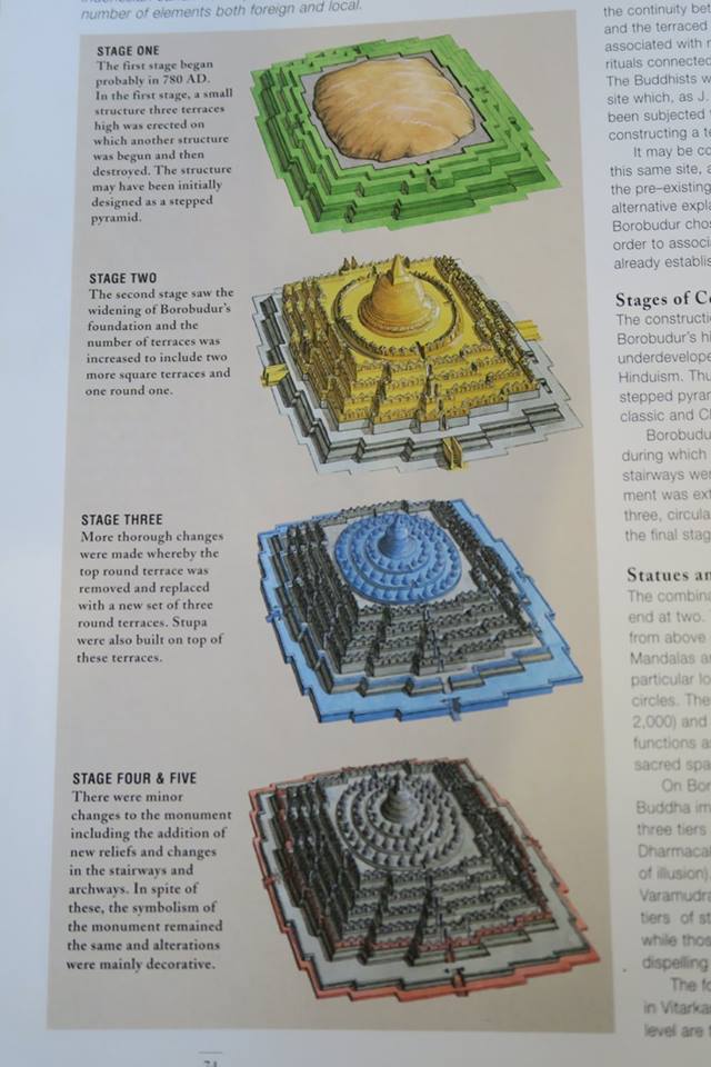จากการศึกษาสรุปข้อสันนิษฐานว่า มีการสร้างใหญ่ ๔ ระยะ เริ่มจากการพูนเนินใหญ่และสร้างฐานสี่เหลี่ยมรอบไว้ ๓ ชั้น คล้าย ๆ ปิรามิด จากนั้นจึงมีการเสริมเติมฐานสี่เหลี่ยมอีก ๒ ชั้น พร้อมลานกลมชั้นหนึ่ง มีพระมหาสถูปอยู่ตรงกลาง โดยมีช่องทางเดินขึ้นทั้ง ๔ ด้าน ต่อมามีการเสริมฐานชั้นล่างสุด พร้อมกับปรับเพิ่มลานกลมเป็น ๓ ชั้น ลดขนาดสถูปกลางลงพร้อมกับเพิ่มสถูปบริวารอีกมากมาย สุดท้ายมีการเสริมเติมฐานล่างพร้อมกับประดับโคปุระและระเบียงรอบ ดังที่เห็นจากการบูรณะปฏิสังขรณ์และเขียนเป็นแผนภูมิไว้