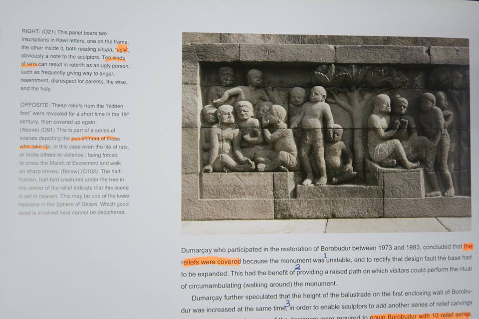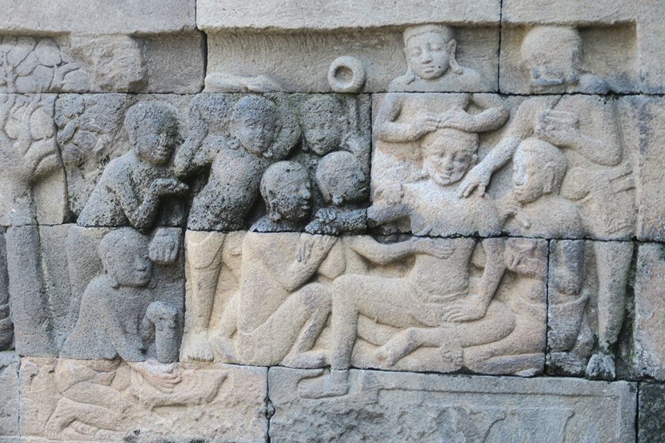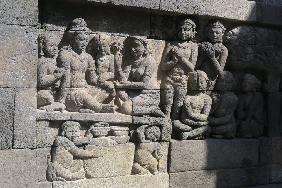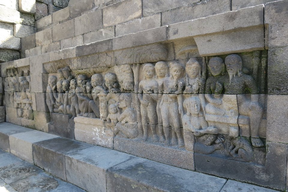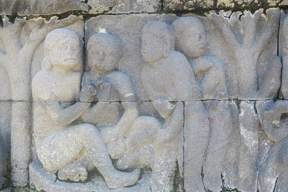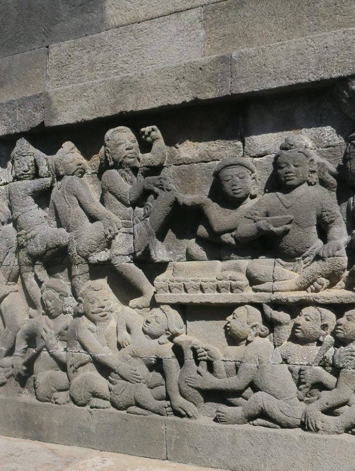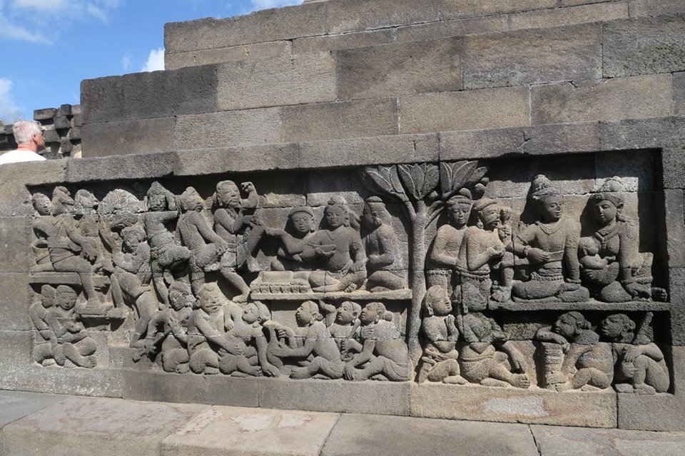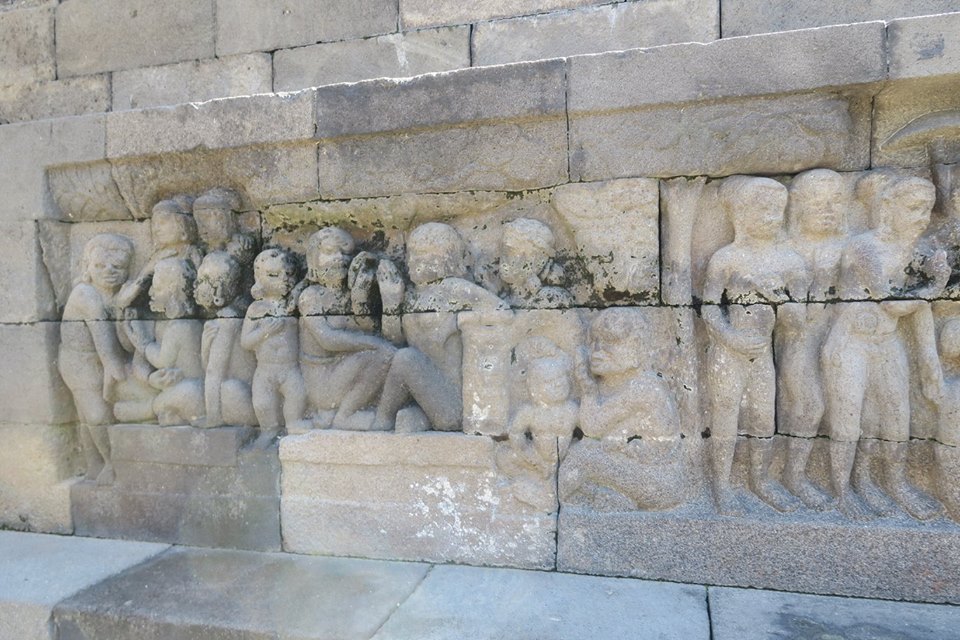 ที่ชั้นฐานล่างสุดที่มี ๔ ด้าน ย่อเป็นด้านละ ๓ ชั้นซ้อนกันอยู่อย่างแมนดาลาหรือมณฑล นับได้ ๑๒ ชั้นที่ว่ากันว่าเป็นชั้นแห่งกามภูมิหรือกามภพหรือกามาวจรภูมิของผู้ที่ยังเวียนว่ายอยู่ในกามนั้น เดิมมีภาพหินสลักประดับไว้ ๑๖๐ ภาพ แต่ต่อมามีการเสริมเติมฐานประทักษิณและปิดทับไว้ทั้งหมด ต่อมาเมื่อมีการขุดแต่งบูรณะจึงพบภาพหินสลักดังกล่าว แต่ต้องปิดทับกลับคืนเพื่อรักษาความแข็งแรงขององค์สถูปไว้ เปิดไว้แต่ที่มุมตะวันออกเฉียงใต้ให้เห็นเพียง ๔ ภาพครึ่ง คือภาพที่ ๑๙, ๒๐, ๒๑ และ ๒๒ ที่แสดงภาพผู้คนที่มีความเป็นอยู่ที่ดี มีการนวดเฟ้น รักษาพยาบาล บันเทิงเริงรมย์ ดังเช่นภาพที่ผมชี้ชวนพี่นิวัติดูนางหนึ่งที่กำลังเล่นพิณเปี๋ยะอยู่ท่ามกลางหมู่คนที่น่าจะสนุกสนานกันอย่างยิ่ง ในขณะที่ขอบซ้ายของภาพที่ ๒๑ มีจารึกกำกับ ๑๐ คนไว้ว่า "วิรูป" ซึ่งมีการตีความว่าน่าจะบอกถึงผลของ ๑๐ กรรมที่ทำจนทำให้รูปร่างพิกลพิการ ส่วนภาพ ๑๙ ที่แสดงการนวดเฟ้นรักษาพยาบาลนั้น นับว่าน่าจะพิเศษมาก ๆ
