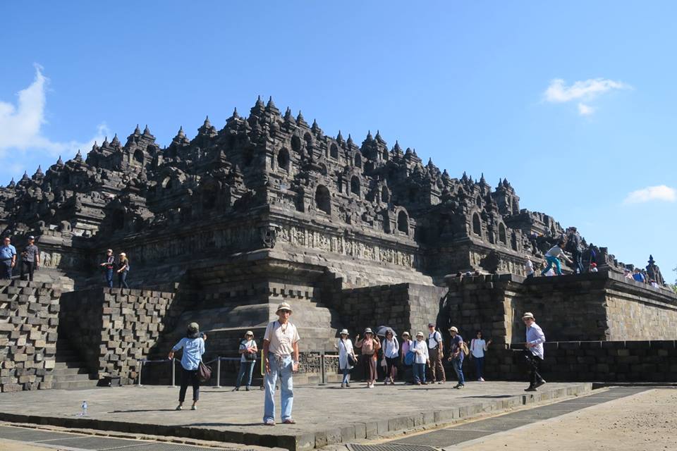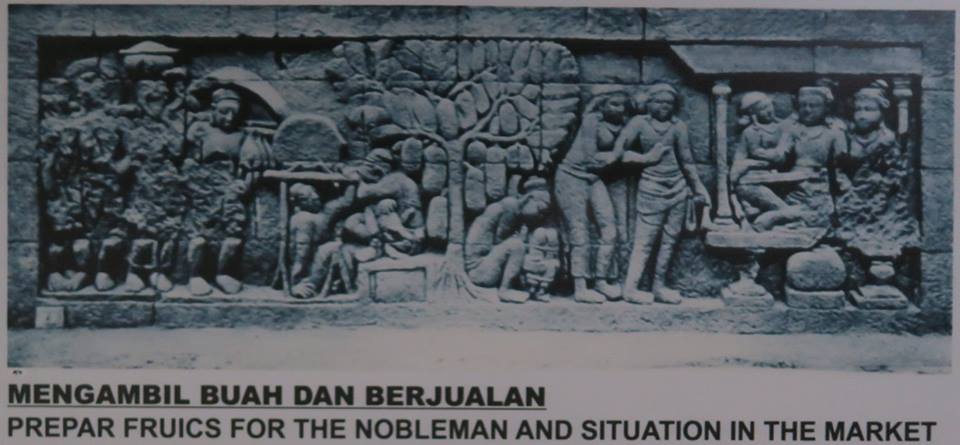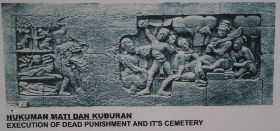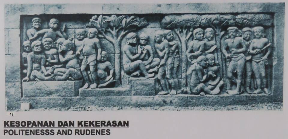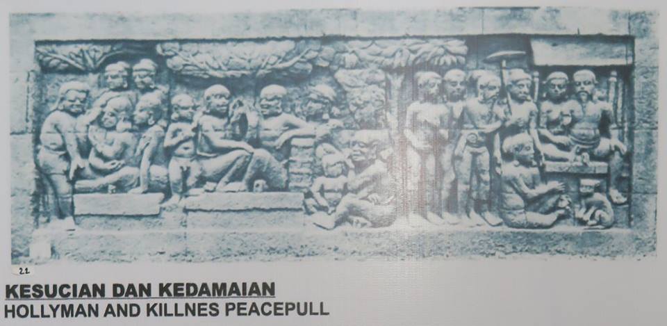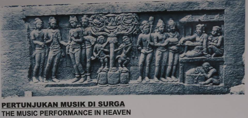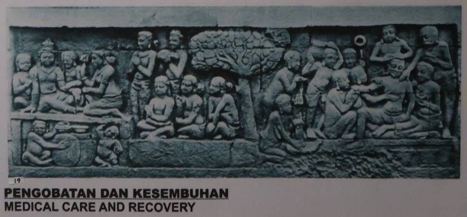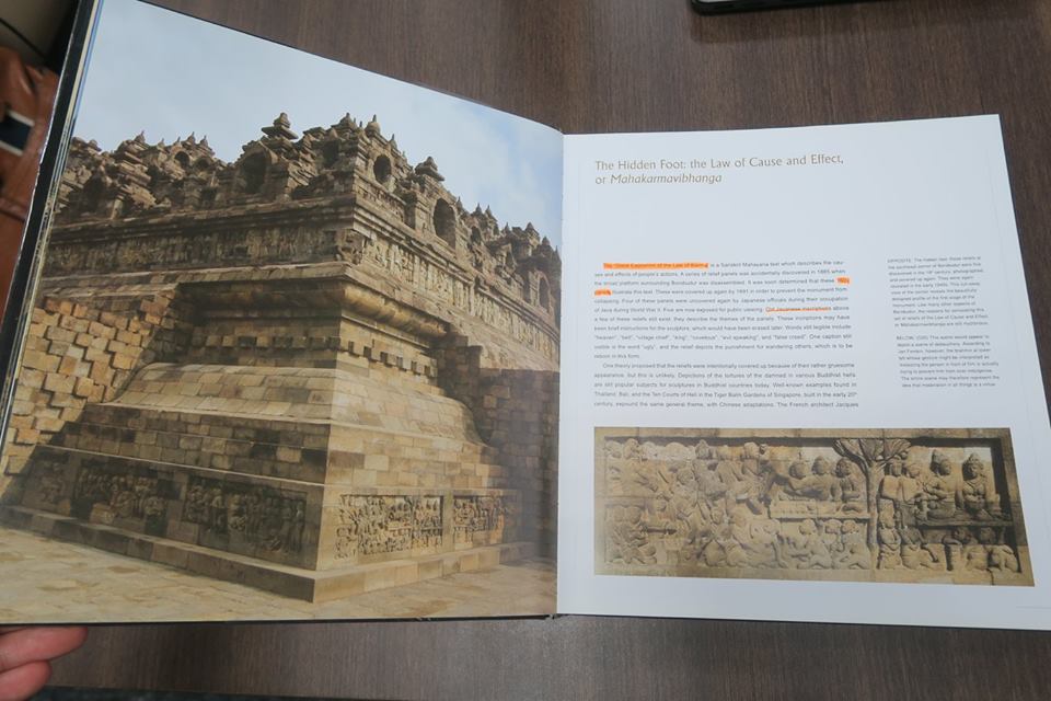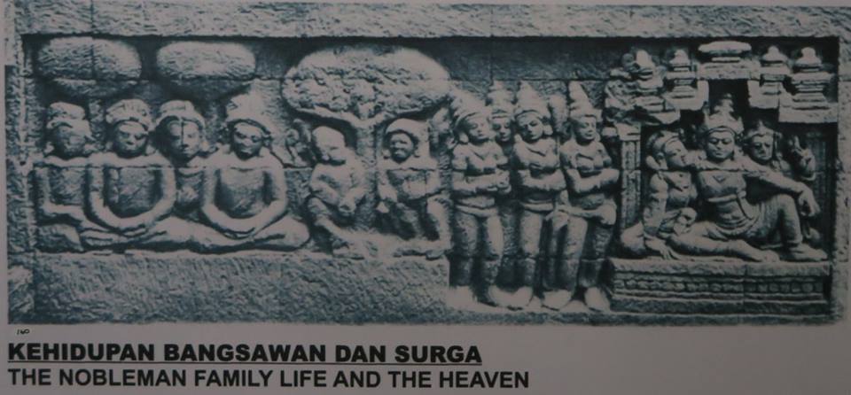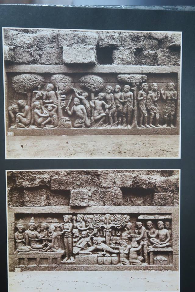 ที่ชั้นฐานล่างสุดที่มี ๔ ด้าน ย่อเป็นด้านละ ๓ ชั้นซ้อนกันอยู่อย่างแมนดาลาหรือมณฑล นับได้ ๑๒ ชั้นที่ว่ากันว่าเป็นชั้นแห่งกามภูมิหรือกามภพหรือกามาวจรภูมิของผู้ที่ยังเวียนว่ายอยู่ในกามนั้น เดิมมีภาพหินสลักประดับไว้ ๑๖๐ ภาพ แต่ต่อมามีการเสริมเติมฐานประทักษิณและปิดทับไว้ทั้งหมด ต่อมาเมื่อมีการขุดแต่งบูรณะจึงพบภาพหินสลักดังกล่าว แต่ต้องปิดทับกลับคืนเพื่อรักษาความแข็งแรงขององค์สถูปไว้ เปิดไว้แต่ที่มุมตะวันออกเฉียงใต้ให้เห็นเพียง ๔ ภาพครึ่ง คือภาพที่ ๑๙, ๒๐, ๒๑ และ ๒๒ ที่แสดงภาพผู้คนที่มีความเป็นอยู่ที่ดี มีการนวดเฟ้น รักษาพยาบาล บันเทิงเริงรมย์ ดังเช่นภาพที่ผมชี้ชวนพี่นิวัติดูนางหนึ่งที่กำลังเล่นพิณเปี๋ยะอยู่ท่ามกลางหมู่คนที่น่าจะสนุกสนานกันอย่างยิ่ง ในขณะที่ขอบซ้ายของภาพที่ ๒๑ มีจารึกกำกับ ๑๐ คนไว้ว่า "วิรูป" ซึ่งมีการตีความว่าน่าจะบอกถึงผลของ ๑๐ กรรมที่ทำจนทำให้รูปร่างพิกลพิการ ส่วนภาพ ๑๙ ที่แสดงการนวดเฟ้นรักษาพยาบาลนั้น นับว่าน่าจะพิเศษมาก ๆ