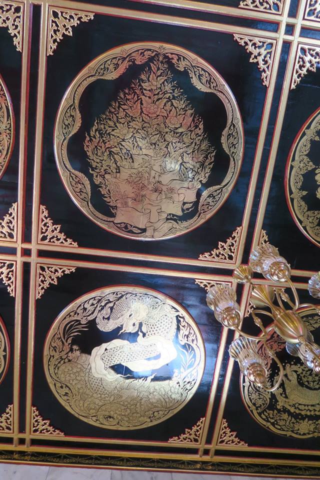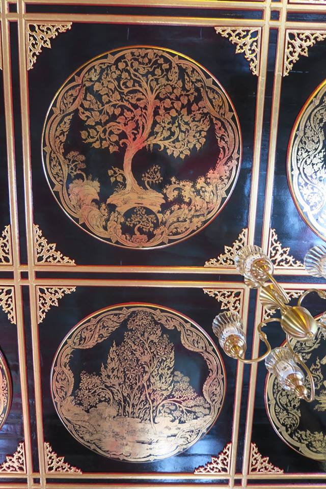 หลังท่านจบเรื่องประวัติวัดสุทธิที่น่าสนใจมากแล้ว ท่านก็ชี้ชวนดูภาพบนฝ้าเพดานชั้นล่างของอุโบสถที่เพิ่งติดตั้งแผานภาพวาดลายรดน้ำลงรักปิดทองงดงามเสร็จสมบูรณ์ท้้ง ๑๐๘ ภาพมงคล โดยมีมงคล ๓๘ แทรกอยู่ในนั้นด้วย โดยท่านเริ่มที่ ๔ มงคลต้นทาง คือ ไม่คบคนพาล คบบณฑิต บูชาคนที่ควรบูชา และ อยู่ในถิ่นที่ควรอยู่ ซึ่งวาดเป็นภาพใบไม้ห่อปลาเน่า ช่อไม้อันงาม ช่อไม้บูชา และ ต้นไม้ที่เติบโตดี เรียงกันตามลำดับโดยทั้งพระ เณรและพวกเราก็ได้แหงนดูกันคอตั้งบ่า