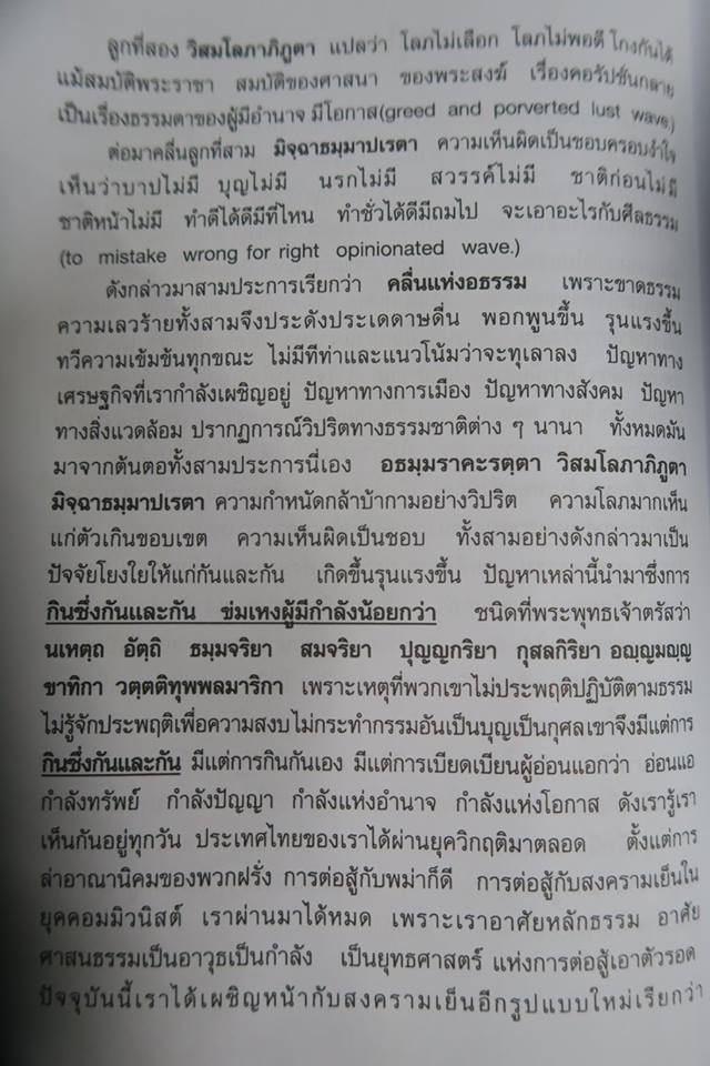 ทั้งสามอย่างดังกล่าวมาเป็นปัจจัยโยงใยให้แก่กันและกัน เกิดขึ้นรุ่นแรงขึ้น ปัญหาเหล่านี้นำมาซึ่งการกินซึ่งกันและกัน ข่มเหงผู้มีกำลังน้อยกว่า ชนิดที่พระพุทธเจ้าตรัสว่า นเหตุถ อตฺถิ ธมฺมจริยา สมจริยา ปุญฺญกริยา กุสลกิริยา อญฺญมญฺญ ชาทิกา วตฺตติทุพพลมาริกา - เพราะเหตุที่พวกเขา ไม่ประพฤติปฏิบัติตามธรรม ไม่รู็จักประพฤติเพื่อความสงบ ไม่กระทำกรรมอันเป็นบุญเป็นกุศล เขาจึงมีแต่การกินซึ่งกันและกัน มีแต่การกินกันเอง มีแต่การเบียดเบียนผู้อ่อนแอกว่า อ่อนแอกำลังทรัพย์ กำลังปัญญา กำลังแห่งอำนาจ กำลังแห่งโอกาส ดังเรารู้เราเห็นกันอยู่ทุกวัน ประเทศไทยเรา....