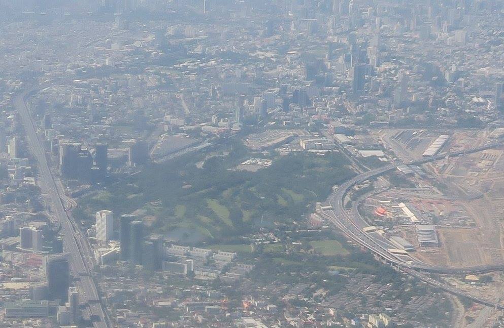 ภาพ สวนโมกข์กรุงเทพที่ริมสระน้อยกลางสวนรถไฟในอุทยานจตุจักร ใจกลางกรุงเทพมหานครที่กำลังขยายตัว มีการก่อสร้างใหญ่ให้กลืนกินทุกสิ่งอย่างลงในไม่ช้า หาต่างอะไรกับเซลมะเร็งร้ายแห่งมหานครที่ใคร ๆ ก็เอาไม่อยู่ แต่อาจเป็นอุปกรณ์การกรรมฐานที่ได้ ก็ได้ (ถ่ายเมื่อเช้าวันที่ ๖ กย.๕๙)