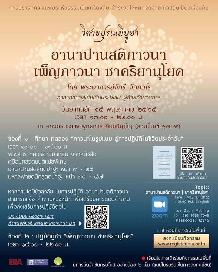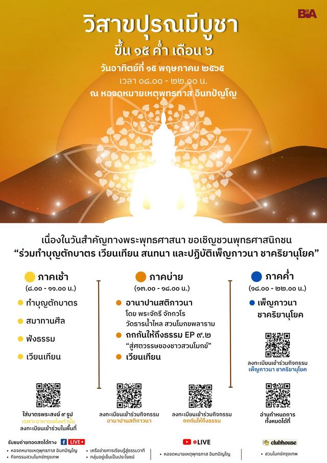 เนื่องในวันสำคัญทางพระพุทธศาสนา ขอเชิญชวนพุทธศาสนิกชน "ร่วมทำบุญตักบาตร เวียนเทียน สนทนา และปฏิบัติเพ็ญภาวนา ชาคริยานุโยค”